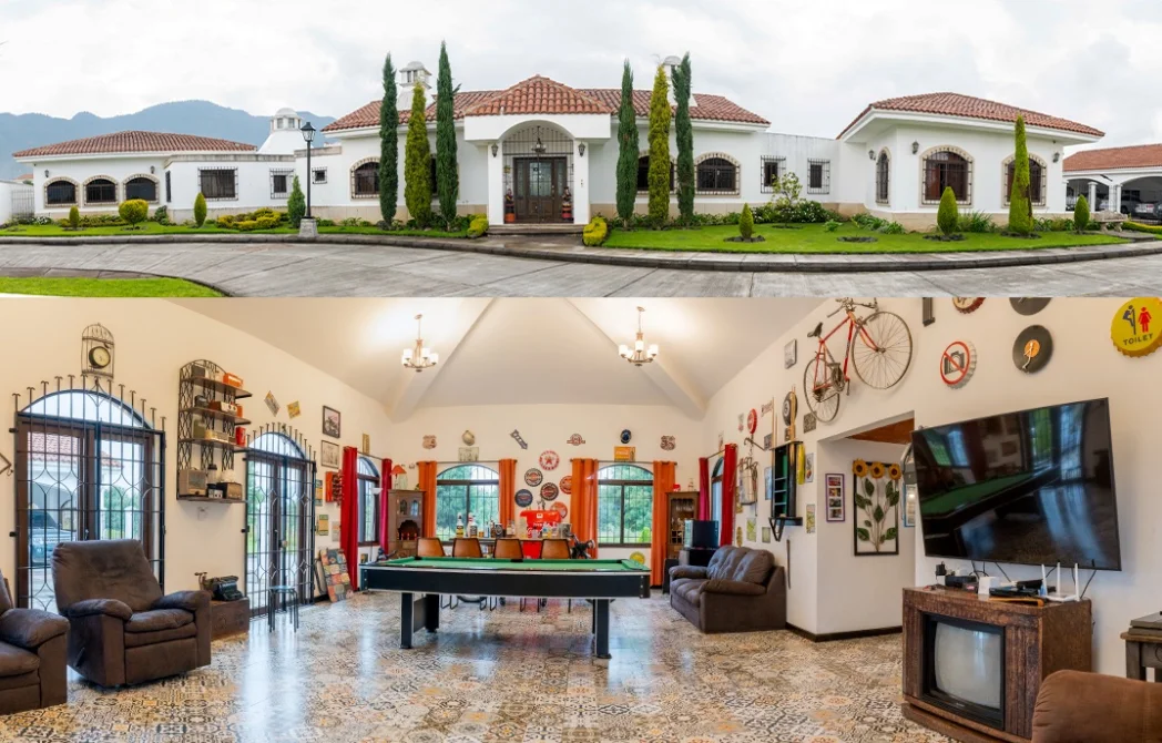 • Área de juegos grande con mesa de billar y bar, con baño propio y chimenea de concreto y ladrillo.